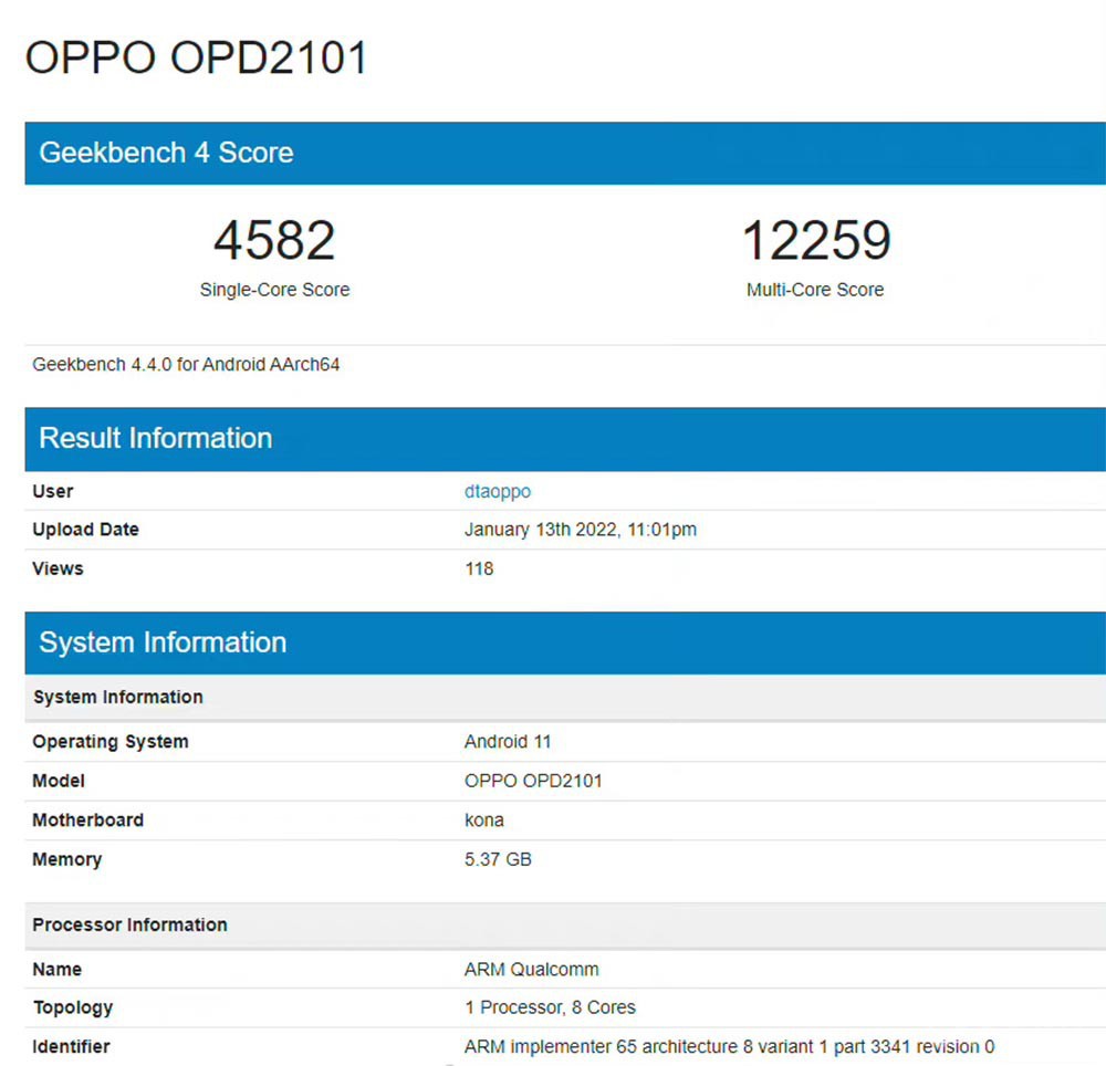 在此前疑似OPPO平板电脑已经通过3C认证后,日前关于该平板在Geekbench上的跑分成绩也已现身,且有消息源还曝光了该机的相关配置信息。在Geekbench 4.4.0 for Android AArch64基准下,其单核成绩4582,多核成绩12259,搭载骁龙870处理器,运行Android 11系统。而从此前3C认证中可以了解到,这款新品配备的是33W快充。