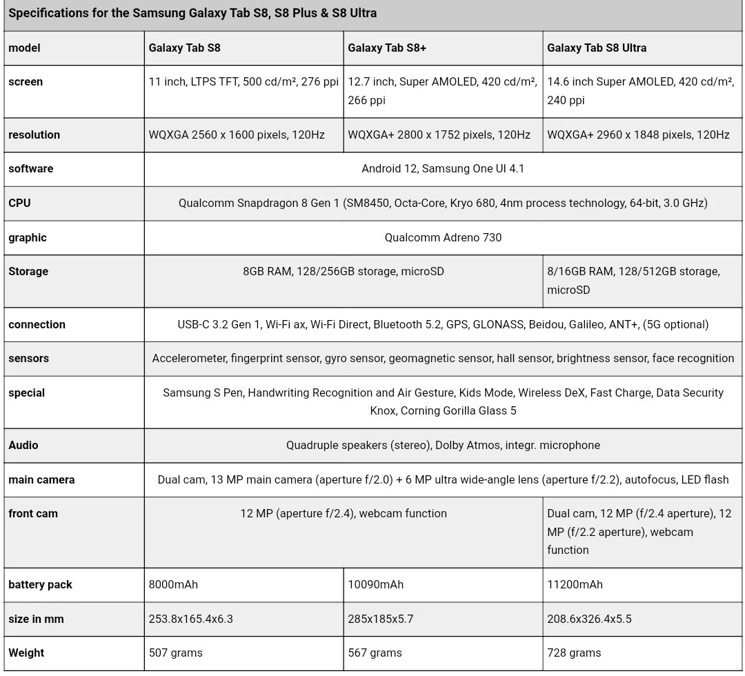 早在几个月前三星Galaxy Tab S8系列就已遭到了曝光,近期外媒有给出了更为详细的参数列表。三星Galaxy Tab S8、Tab S8+、Tab S8 Ultra三款平板均搭载高通骁龙8 Gen1,不同的是屏幕规格、电池容量、三围数据、前置摄像头和储存版本。