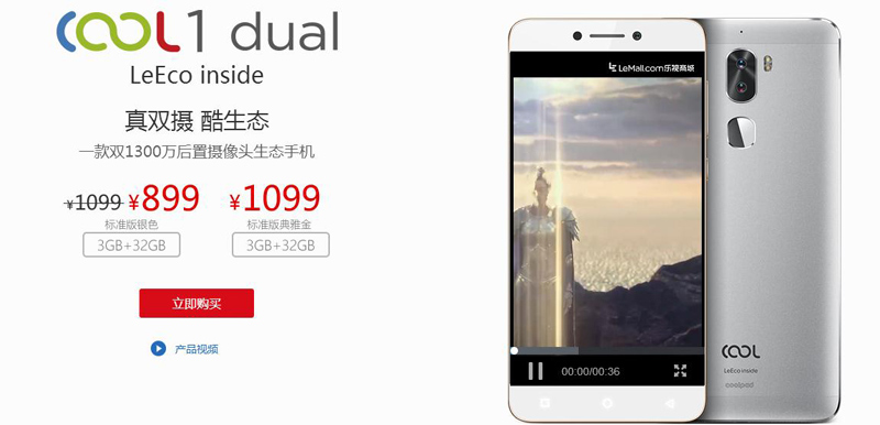 cool1 dual是今年乐视和酷派合作推出的首款双摄千元手机,现在乐视官网上银色版本直降300元,仅售899元。