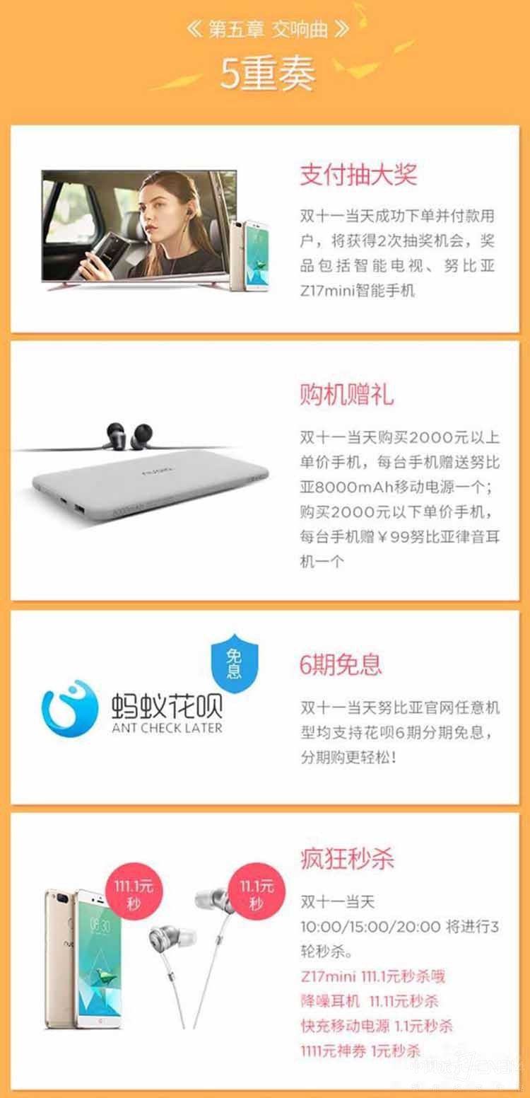 并且好戏还没有结束,在双十一当天下单的用户,还可以参与各种活动。成功下单便有机会抽取智能电视以及Z17mini手机;购机便可获赠移动电源或耳机一个;并且当天还有秒杀活动,这样的五重奏你还满意吗?