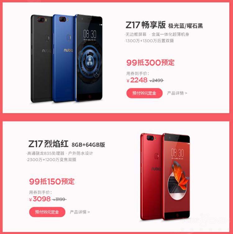 另外,努比亚还开启了新品预售活动,亲民无边框Z17畅享版的极光蓝和曜石黑配色可以享受定金99抵300的优惠,火辣的Z17 烈焰红配色8G版也可以说享受定金99抵150的优惠。
