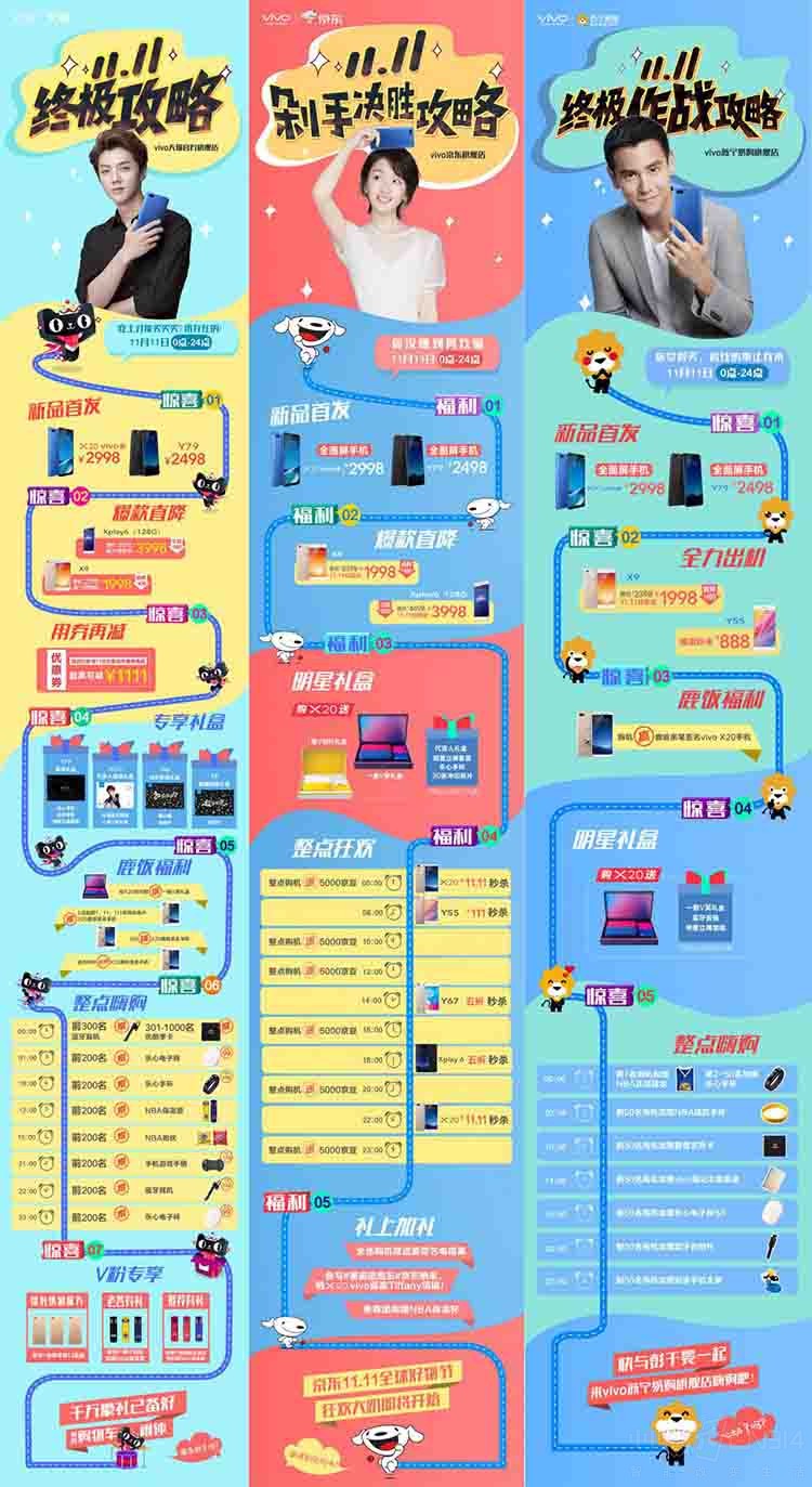不过,鉴于各种促销的混杂,一时间多数网友也难以辨别买哪一款与该怎么买才最实惠。似乎是看到了众多网友的心声,vivo就联合三大代言人鹿晗、周冬雨、彭于晏和天猫、京东、苏宁来了一次vivo版双11终极攻略,让网友可以在电商平台买到最贴心的vivo手机。