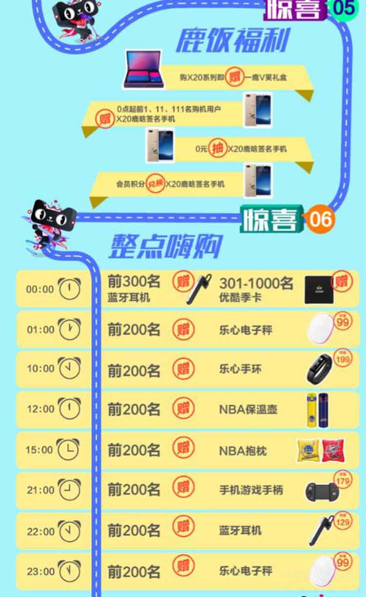 而且购买X20的用户还可可获赠一鹿V笑礼盒,如果你是整点购机第1名的幸运儿还可获赠NBA正版球衣呢!当然没抢到第一名也不要灰心,在后续整点购买的用户好礼送不停,奖品包括乐心电子秤、NBA硅胶手环、蓝牙自拍杆、爱奇艺月卡等,让你双11剁手high起来。
