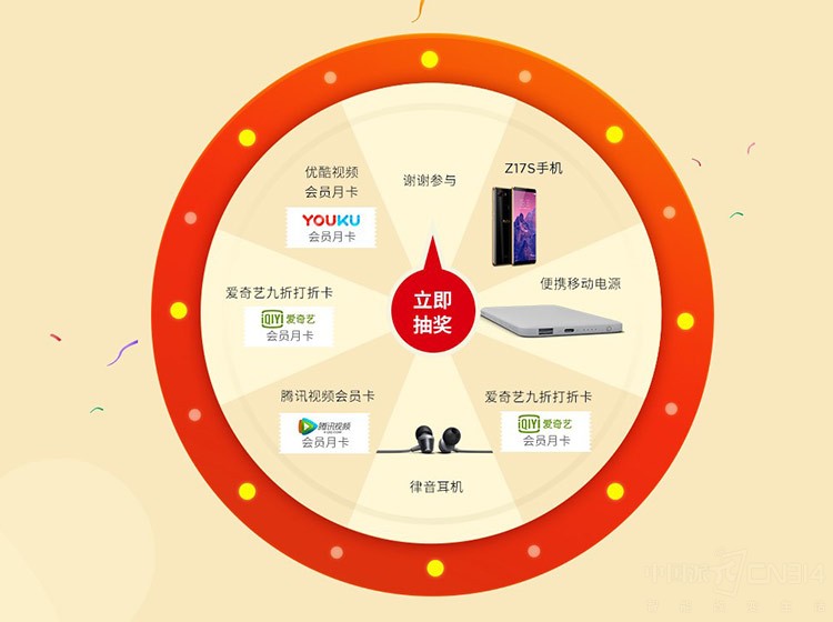 正如我们开头介绍过的,努比亚为回收用户提供了1次抽奖机会,最高可抽取到Z17S这款“全面屏+无边框”手机。次外,用户还有机会获得律音耳机、便携移动电源和视频会员卡(腾讯视频、优酷视频和爱奇艺)等奖品。参与方法上,每个用户/ID成功回收后,就可参与幸运大转盘活动,抽取努比亚提供的幸运奖品。