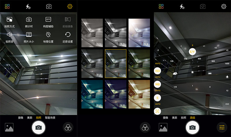 拍照界面和滤镜组合,以及专业模式,可以调节ISO、EV、S、WB、AF,满足了具有一定摄影基础的朋友之需求。