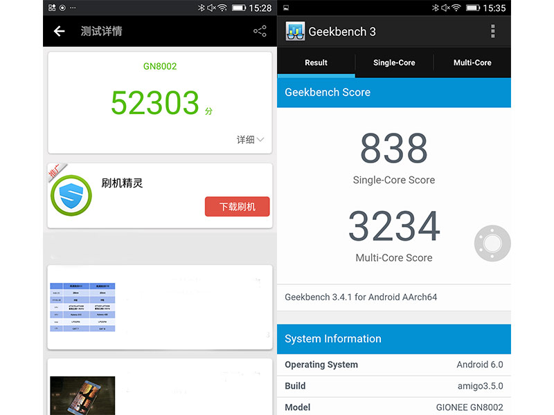 安兔兔和Geekbench3跑分图,对于Helio P10来说,这样的成绩应该说属于正常水平,应付日常生活还是完全没有问题的。经过实测发现即使是运行《王者荣耀》类的大型竞技类游戏,也没有出现掉帧现象,所以大家不用担心金立M6 Plus的性能。