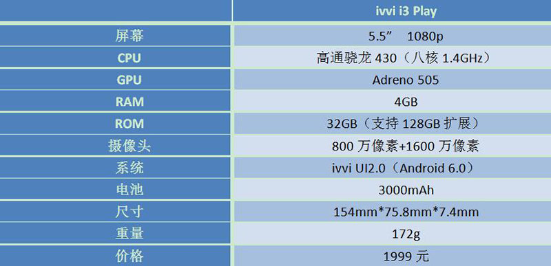不管是外观、拍照还是系统,ivvi i3 Play的时尚创新风格都深入人心,在至关重要的性能方面,i3 Play同样没有让用户失望。高通骁龙64位八核处理器辅以4GB运行内存,保证了手机能够始终保持流畅运行;32GB机身存储并支持128GB SD卡扩展保证用户可以存储足够多的影音娱乐资源。