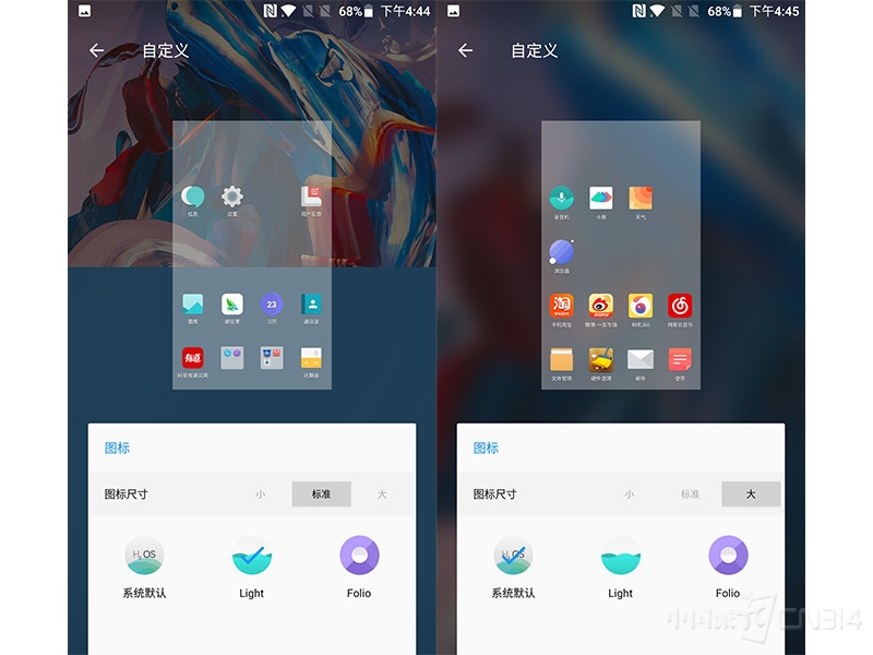桌面的整体布局同样可以变换风格,图标尺寸可以进行三挡调节,系统UI图标还有默认/Light/Folio三种风格可选。