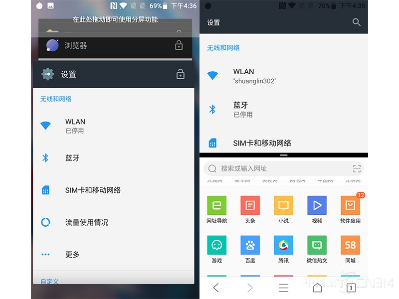 分屏堪称是本次升级的最大亮点之一,用户只需进入多任务界面,拖动想要分屏的任务即可,右图为设置界面和浏览器双应用。唯一的遗憾是现在的分屏支持应用并不多,不过作为能够尝鲜7.0的用户来说,等待一些时日应该也是无妨的。