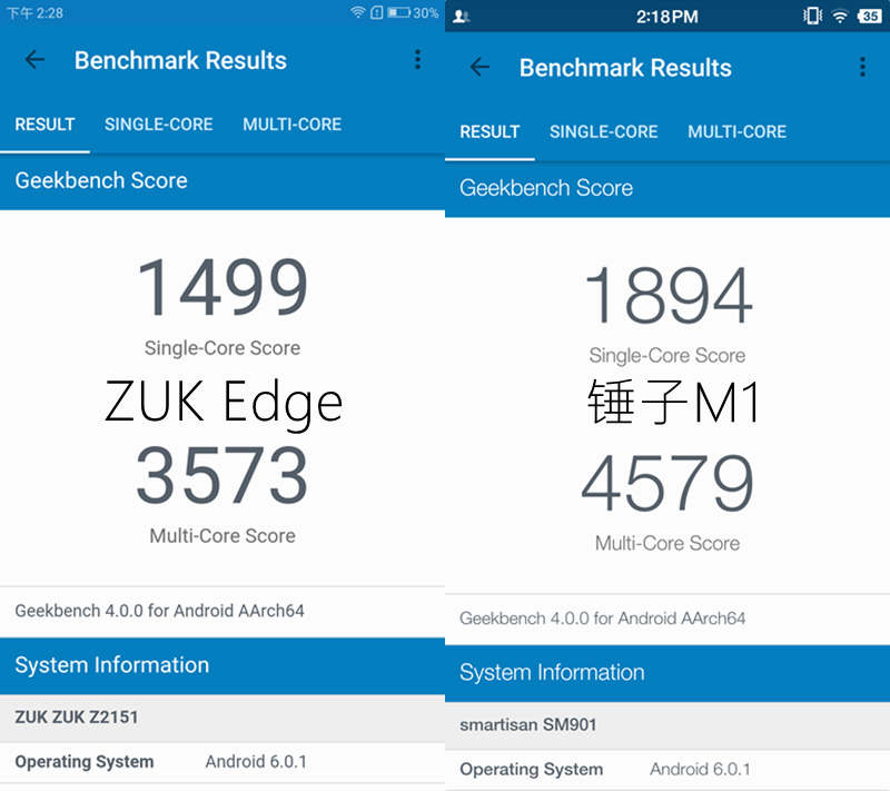ZUK Edge处理器单核得分1499,多核得分3573,锤子M1单核得分1894,多核得分4579,虽然搭载同款处理器,但是ZUK Edge远没有锤子M1强悍,当然这个成绩和安兔兔截然不同,再一次向我们验证了跑分软件的不可靠性。