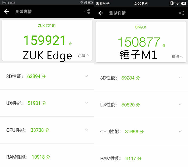 锤子M1和ZUK Edge都配备了高通旗舰处理器骁龙821,并且在主频上都没有进行阉割,RAM方面锤子M1只有4GB版,而ZUK Edge则在2499元价位的臻享版中添加了6GB版,在照片和歌曲越来越大的今天,ROM也成了每个人关注的点,锤子M1仅有32GB版本,而ZUK Edge则配备了64GB ROM,显然要比锤子M1好一些,当然,即便是相同处理器,不同厂家对其优化程度也不一样,我们来看看两款手机性能表现如何。