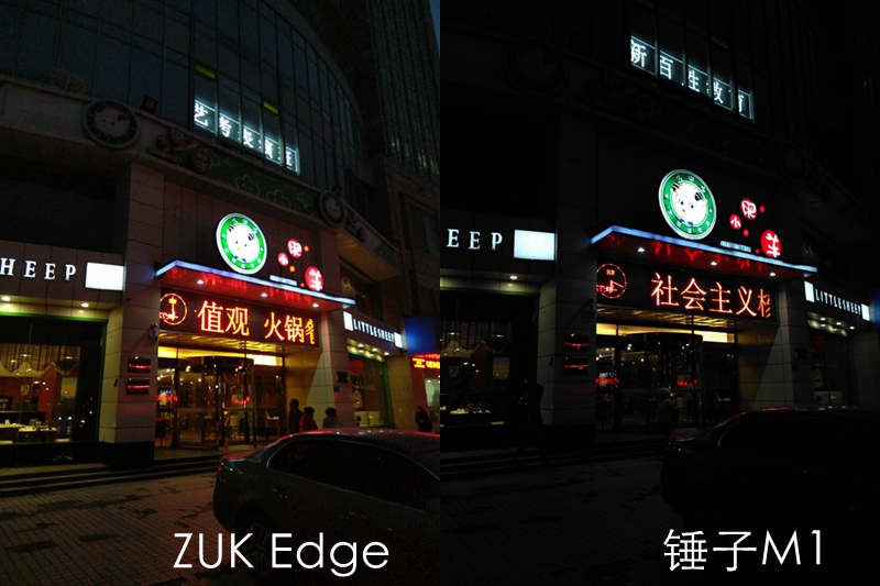 拍摄时天还不算太暗,肉眼对于地砖可以清晰可见,两款手机的测光点均为小肥羊的LOGO,从样张来看锤子M1画面虽然纯净度高一些,但是除去小肥羊LOGO外暗处细节几乎丢失,而ZUK Edge表现则好一些。