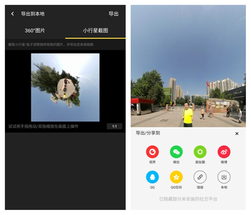 用努比亚NeoAir app拍摄的照片要想使用,得从中导出,在这张全景照片导出时可看到用于分享的选项:有视界、微信、朋友圈、微博、QQ等多种选项,方便我们随时分享,在进入这些选项后,除了会出现360°图片还有一个小行星截图,可随意移动手指转换截图角度,这又是一种新的玩法甚是有趣。