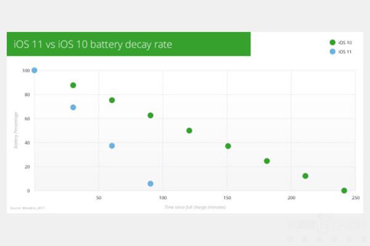 根据Wandera调研的50,000名运行iOS11(老设备升级)和iOS10的苹果用户数据来看,iOS11设备的耗电速度是iOS10的两倍还多。iOS10在电池耗尽之前平均的使用时长为240分钟,而iOS11平均只能坚持96分钟,可以说iOS11对于老设备来说简直就是电量杀手。