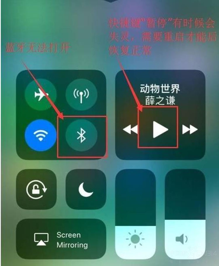 控制中心的蓝牙无法开启,只能通过设置将蓝牙打开,升级到iOS 11的用户很多都能发现这个问题,毕竟自iPhone 7开始,iPhone就取消了3.5mm耳机,因此很多朋友都是选用的蓝牙耳机。本来作为取消耳机孔始作俑者的苹果就备受吐槽,现在连蓝牙耳机都不让人好好用了。除了蓝牙快捷键外,音乐快捷键的暂停键也有时候会无法正常使用,歌曲显示不同步。