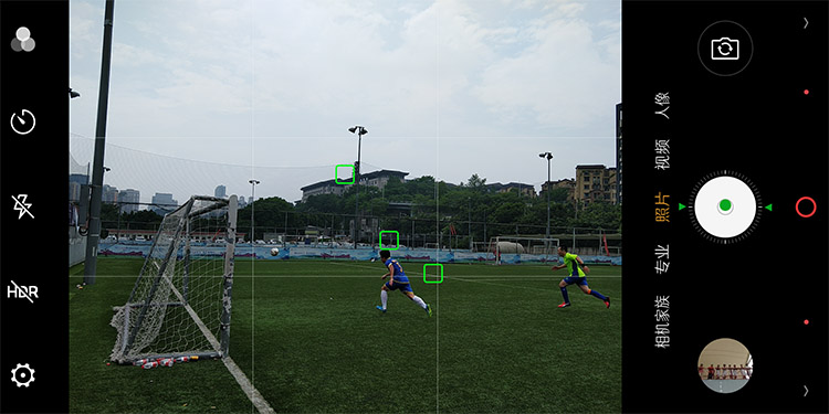 大家都知道,足球运动员的瞬间爆发力是极强的,虽然图上的这两位并不是专业级别的运动员,但看他们摆臂和迈步的幅度,以及右边那位双脚离地的景象,就能想象到他们正处于高速奔跑的状态下,去追逐那一粒足球。但即使这样,足球上的纹路,两位球员腿部的肌肉线条,乃至鞋底的鞋钉都如同人肉眼观看到的一样清晰,而这都得益于多点对焦快至0.03s的对焦速度,可以瞬间识别到对焦主体。