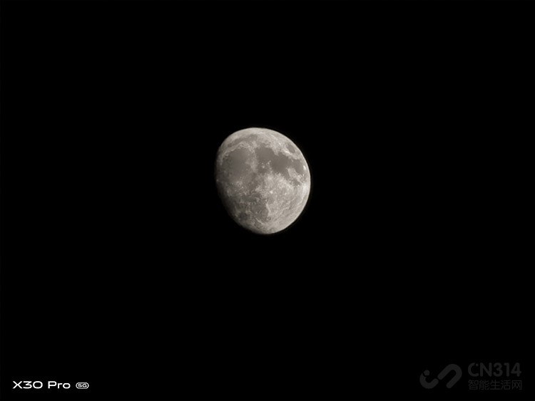 当然,60倍变焦不仅仅能让你看到景物,配合一种超分算法,vivo X30 Pro还可用来拍摄月亮。拍摄当天我们运气还算不错,晚上天空较为晴朗,人的肉眼可以看到月亮,普通模式下夜空中的月亮是这样的: