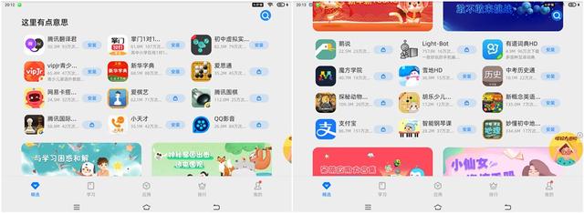 打开两台学习机应用商城的“精选”页面,差别也很大。步步高S5 Pro页面很丰富,可以向下滑很长的距离,我随机截了两次,这“精选”的内容很辣眼睛。讯飞X2 Pro的“精选”很简单,只有一页。