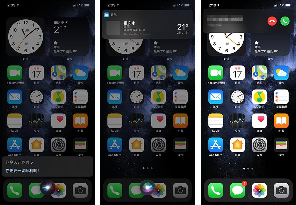 悬浮窗也用于 Siri 上,现在喊一句“嘿 Siri”,不会再看到全屏显示窗口,而是底部弹出的一个小圆圈。当你说出自己的需求后,Siri 的答复也是以弹窗样式呈现,这一点与国内许多安卓系统AI语音助手一样。