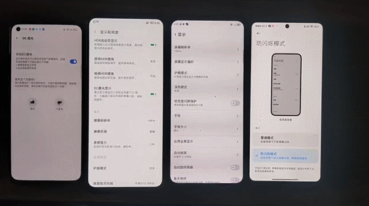 这个功能就不多说了,现在OLED屏幕几乎必备,没有就准备等着“瞎眼”吧。这四款手机里,除了红魔6 Pro没有DC调光之外,另外三款都有,但效果如何还是要看实际对比。四款手机都开启25%左右的亮度,用手机拍摄是否有频闪。