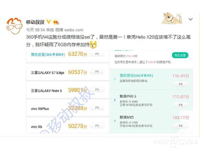 业内对于360手机N4的关注很大一部分来源于联发科十核处理器Helio X20,这款处理器定位高端,首次采用了三丛十核的架构,将任务按照轻重等级进行更精细的划分,使用CorePilot 3.0异构运算技术在三个丛集间对十个核心进行自由调度和搭配,官方表示平均功耗相比传统双丛集降低了30%,同时运算能力提升了15%。在业内人士看来,Helio X20有望成为联发科对抗高通以及三星高端处理器的重要武器。从前段时间曝光的360手机N4跑分图可知,强悍配置已经秒杀很多“友商”的旗舰产品。而且据当时某业内人士的微博来看,大内存N4似乎在情理之中。