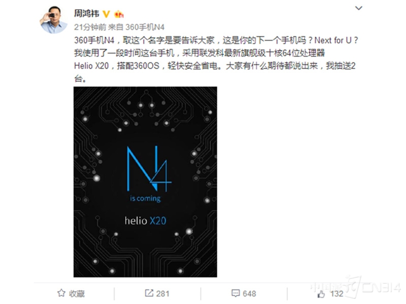 【CN314智能生活】360周鸿祎的率性为其赢得了无数粉丝,最近的例子当属老周“批评”自家文案:一个Helio X20还“遮遮掩掩”。就这样360手机N4一度成为行业重点关注对象,就在大家还在对N4的配置进行“天马行空”的揣测时,老周直接用微博告诉网友:这款手机很不错。