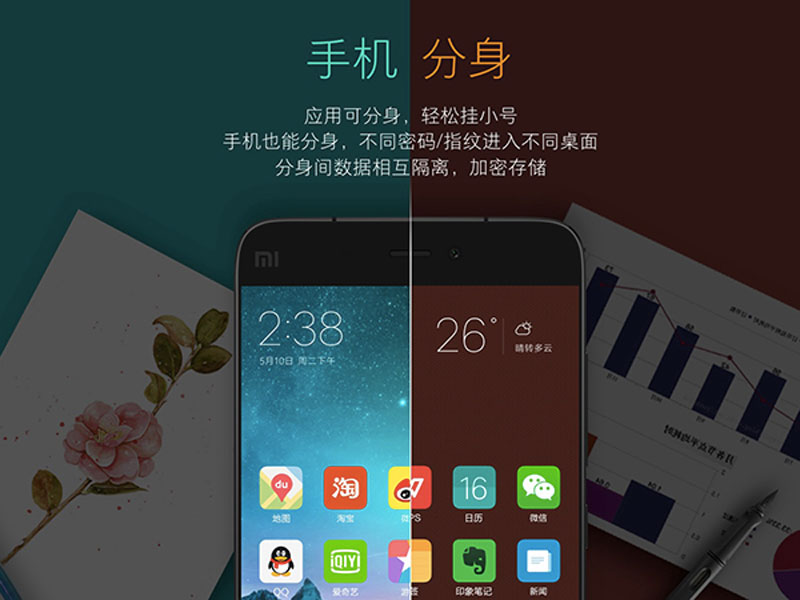 如今,很多人为了将工作和生活分开,会选择注册两个微信号或者带上两部手机。实际情况却是要频繁的来回登录和切换账号或者查看两部手机中的信息,让人感觉分身乏术。MIUI 8系统的全新升级彻底改变这一现状,给用户带来了真正的分身术。