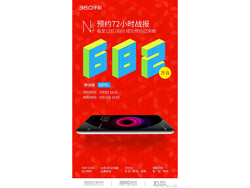 截止到5月10日下午4点,360手机N4的预约量突破316万台;5月11日下午4点,预约量达到513万台;5月12日下午4点,预约量达到682万台!短短72小时,售价899元的智能手机,近700万的预约量,试问360手机N4到底是何方神圣?