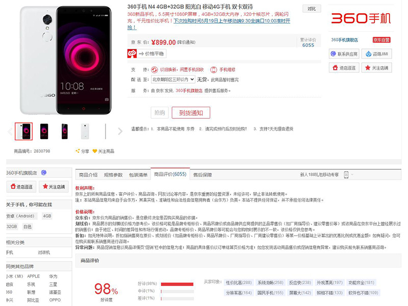 从5月9日下午4点开始,360手机N4的预约量直线上升,截止88小时,预约量已经突破807万,首销更是以超过15万台的成绩遥遥领先同档产品。在某些品牌被曝强迫自家员工购买冲量的同时,360手机N4的现象级表现值得关注。值得一提的是在京东的好评率,N4以98%的高好评率超越众多旗舰产品——包括iPhone6s和三星S7 edge等。群众的眼睛是雪亮的,N4有望成为2016年度最具竞争力的青年旗舰机型。