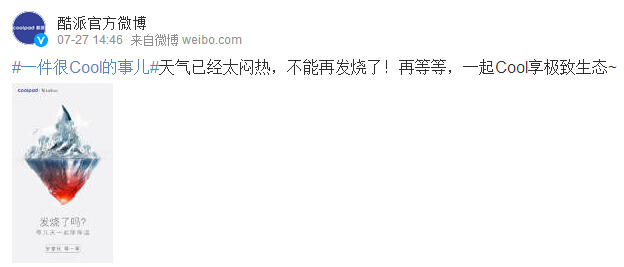 就在今天,酷派在官微中发布了一张海报,一座冰山水面上下两部分居然对比十分鲜明。水上部分是我们经常看到的冰山,而水面以下是一座类似火山的东西,“发烧了吗?等几天一起降降温”“好家伙,等一等”这样字眼让我们都看不出个所以然。不过,“发烧”二字有着明确的指向,可能就是国内著名的、以“发烧”为核心的品牌小米!那么为什么说一起降降温呢?难道是要给小米的产品降温吗?或者是说要酷派要联合乐视推出一款全新的产品开启嘲讽模式?