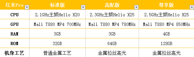 具体而言,红米Pro标准版的Helio X20处理器主频为2.1GHz,比官方的2.3GHz有所降频,而Mali-T880 MP4 GPU也从官方的780MHz降到了700MHz;而红米Pro高配版和尊享版处理器则为Helio X25,并且没有经过降频处理,CPU和GPU的频率分别是2.5GHz和850MHz。