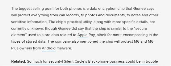 DigitalTrends称,“中国手机厂商金立想让你忘掉Blackphone、Turing Phone,还有 BlackBerry Priv。因为金立相信他们刚发布的旗舰手机M6和M6Plus是‘更安全’的手机”。事实也确实如此,金立M6系列与众不同的最大亮点就是内置的安全加密芯片,所有涉及到安全操作都会在这枚芯片当中进行;同时,这枚芯片具有不可逆向解密的特性,非使用者本人想要获得内部数据的可能性微乎其微。从这个角度上来说,这枚内置的加密芯片会大大提升手机的安全性,为用户的隐私安全构筑一道无形的防护阵线。