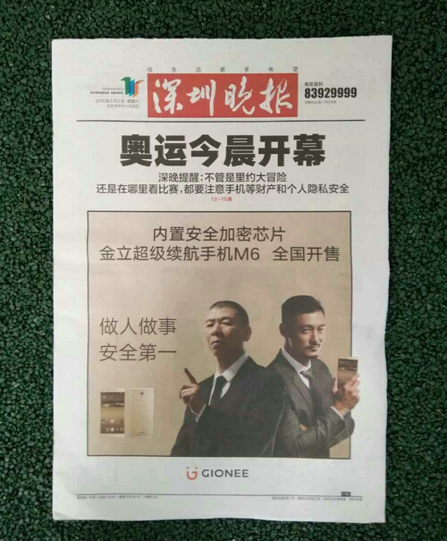 而在赛场之外,有爱好者发现了国内著名品牌金立在报纸头版头条上的大幅广告,广告中冯小刚和余文乐手持金立M6系列手机的造型令人印象深刻。值得注意的是,文案上“做人做事、安全第一”的字眼让人不由得将金立M6系列跟近期的里约奥运会联系起来,众所周知里约奥运会上除了精彩纷呈的比赛之外,当地令人堪忧的治安状况也是一个“看点”,而频发的手机被抢被盗事件也将手机安全这个话题推上了风口浪尖。