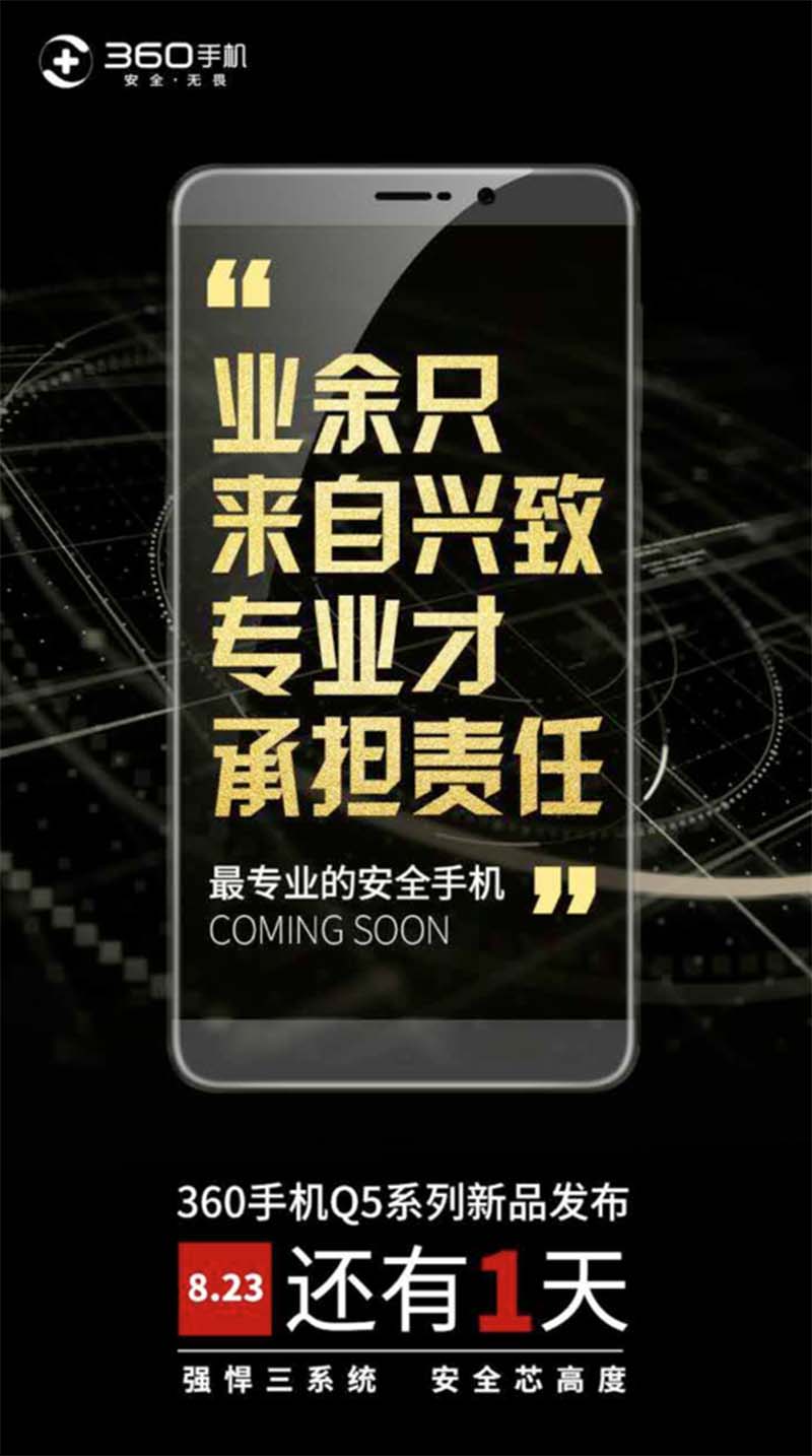 【CN314智能生活】360Q5倒计时1天海报发布, 海报文案“业余只来自兴致,专业才承担责任”,既强调专业又突出责任。由此不难推断,360Q5主打应该是精英人群,或为公司管理层专门订制。360手机一直打造安全这个卖点,从差异化营销的角度来讲,越是企业高层人员或者政府高层人员,级别越高,责任越大,掌握核心机密越多,对保密和安全的需求也越大。360Q5正是寻找到了这类人群的痛点。
