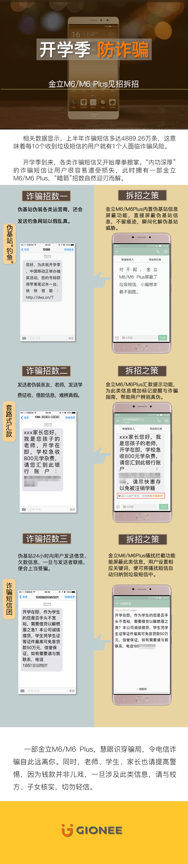 如果收到来路不明的电话短信,该如何判定真伪?看似无从下手,其实见招拆招!金立最新推出的M6/M6 Plus内置安全加密芯片,不仅拥有“私密空间2.0、专线通话”等硬件级的安全防护,还拥有基于软件系统的“安全十防”功能,全方位的保护家长与学生免收诈骗信息的困扰。