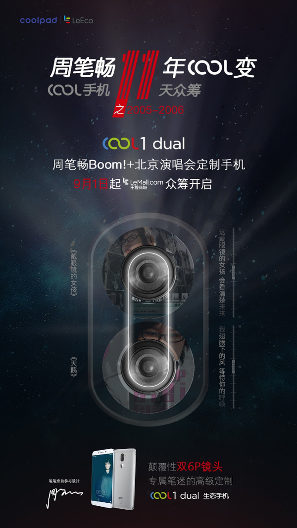 【CN314智能生活】随着cool 1 dual的大卖,这个年轻的品牌为何能获得如此高的人气成为业内都很关注的话题,酷派与乐视在背后做了哪些工作进行推动更是让人们颇为好奇。而就在业内针对这个问题讨论得火热的时候,酷派乐视又弄出了一个大新闻,据了解cool1 dual将会推出周笔畅Boom!+定制版,9月1日起在乐视商城开启众筹、为期11天,而“11”代表着周笔畅从05年超女开始出道已经11年。