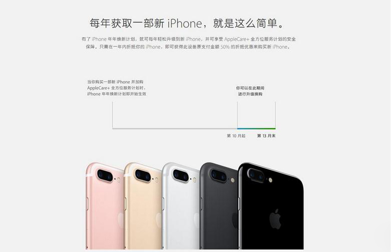 如果参与了这个政策,到了下一代手机发布的时候,也就是从买了Apple Care+全方位服务计划的第10个月到第13个月,可以用当时购买iPhone手机金额50%的折抵优惠来购买新iPhone,大概就是2694元。听到这中国的小伙伴是不是一脸的懵逼,就算现在已经发布两年的苹果6,在二手市场仍需要2000+的价格才能买到,更何况是上一代苹果6s。这样看来这个计划在中国肯定行不通,毕竟还没到人傻钱多的地步。