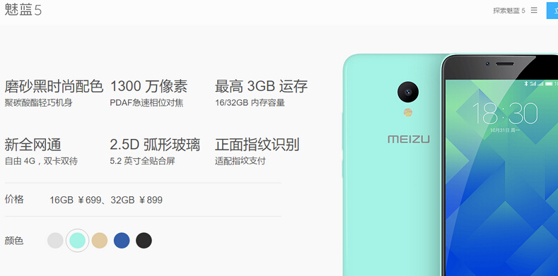 硬件配置方面,该机搭载联发科MT6750真八核处理器,2GB/3GB RAM+16GB/32GB ROM的存储配置,运行基于YunOS深度定制的Flyme 5.1系统,照样子来看应该能做到日常使用的流畅不卡顿。前置500万像素自拍镜头、后置1300万像素主摄像头,采用f/2.2光圈和5P镜头组,支持PDAF相位对焦和1080p视频拍摄,对于699元这个价位来说确实是比较不错的。内置3070毫安时容量电池,按照经验推测基本能满足一天的正常使用,但重度使用还是逃不过一天两充。