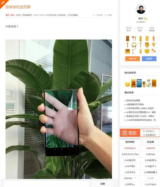 近日,火爆的小米MIX又被开发出一种新玩法,小米ceo雷军在论坛上贴出了MIX的一种新的玩法,照片中的小米MIX看似透明,握住手机的手心清晰可见,小编研究了一下,实际上这是先拍下一张手的图片,利用画面和实景重叠的方法实现了这个“特技”,得益于小米MIX的高屏占比,这个玩法在小米MIX上效果格外突出。