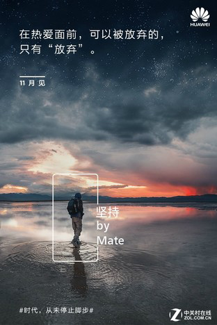 在官方微博中,华为陆续放出了两张主题为“时代,从未停止脚步”的海报,海报上透露了11月即将发布新Mate手机。“不放弃,是对自己与时代最好的坚持与热爱。新Mate,永不停止前行。”,“不设限,不畏惧,突破极限才能有所改变。新Mate,与你一起,放胆突破。”