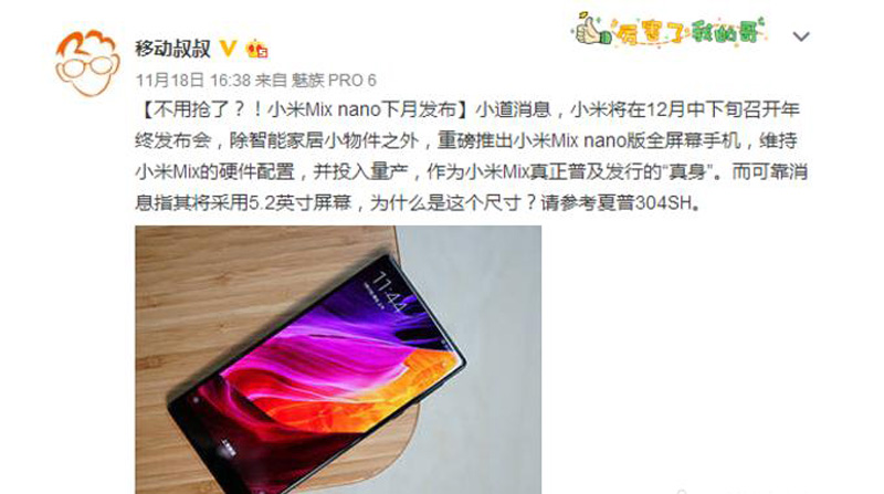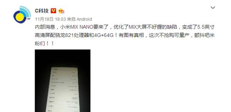 微博博主@C科技也发布会称:小米 MIX NANO要来了,优化了大屏不好握的缺陷,变成了5.5英寸高清屏配骁龙821处理器和4GB(RAM)+64GB(ROM)!有图有真相,这次不抢购可量产。此外,还要网友爆料手机不排除使用5.2英寸屏幕的可能,发布时间可能在今年年底或者明年年初,但并没有一个确切的消息。