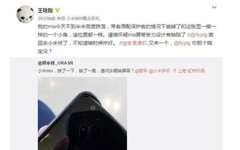 此外,因为小米MIX硬度非常高,相应的韧性就非常低,手机极其容易被摔坏。现在已经有不少买到手机的用户抱怨,即使带着官方手机套也非常容易摔坏。而且最重要的不是屏幕不禁摔,陶瓷机身也非常脆弱。对此,行业专家也对小米MIX的设计提出质疑,即使带着原配保护套,仍很多用户出现同样位置、同样形状的破损,很有可能是小米MIX屏幕受力设计有缺陷。