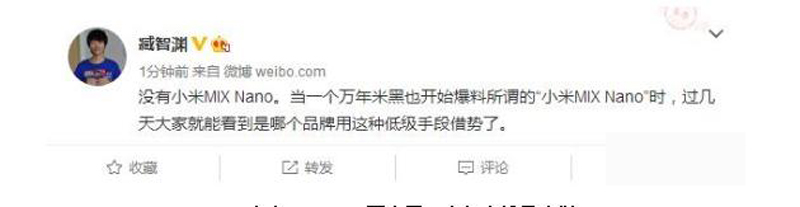【CN314智能生活】前段时间关于小米NANO的各种猜测和曝光谍照漫天飞,而且根据爆料手机还会弥补小米MIX产量不足而进行开放式购买,让不少米粉看到了希望。但是@臧智渊(小米手机产品市场总监)在微博表示:没有小米MIX NANO。当一个万年米黑也开始爆料所谓的“小米MIX Nano”时,过几天大家就能看到是哪个品牌用这种低级手段借势了。简单来说,这只是某个品牌在用这种低级手段界小米MIX进行借势营销。