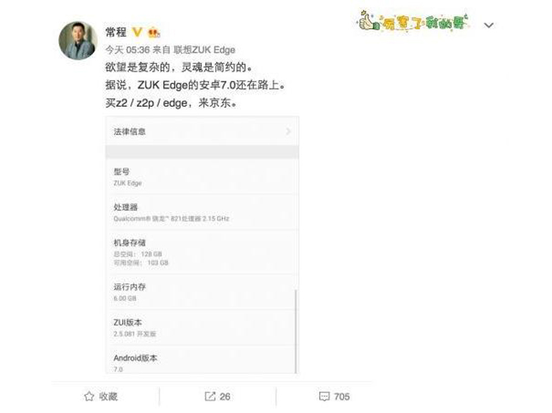 虽然早前联想曾经说过要精简手机业务,取消乐檬和ZUK产线,只保留Moto一个品牌。但是肯定需要一定的时间,乐檬系列自去年年底发布乐檬X3以后已经停止更新产品,但是ZUK仍然在运营。最近关于ZUK的一款新机也逐渐浮出水面,新机的“泄密者”同样是联想副总裁常程。@常程发微博称:“欲望是复杂的,灵魂是简约的。据说,ZUK Edge的安卓7.0还在路上。买z2/z2p/edge,来京东。”还放出一张ZUK Edge新机的手机界面,新机同样运行Android7.0系统。按照常程的说法,新机已经基本研发完毕,现在应该是等待Android7.0系统测试完成以后,手机会搭载最新系统上市。