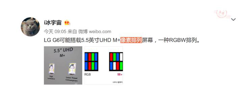 【CN314智能生活】LG和三星同样作为韩国的手机品牌,但是LG手机的发展之路并没有像三星一样顺风顺水,虽然屡战屡败但并没有因此放弃手机的创新之路。近日关于LG G6曝光消息不断,因为LG G5市场表现不好,所以在LG G6身上不会沿用模块化设计。同时微博博主@i冰宇宙爆料,LG Display展示了基于M+次像素排列技术的5.5英寸UHD屏,一般UHD(超高清显示屏)被认为是4K分辨率的代指。从技术概要来看,M+排列加入了白色,形成RGBW,在色域、色准表现上应该比传统R排更加进步,而且高亮、省电。