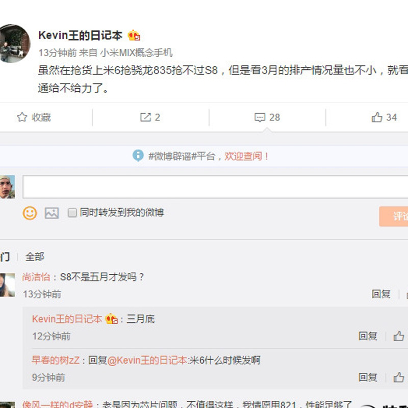 对此,业内人士@Kevin王的日记本 在微博上表示:“虽然在抢货上米6抢骁龙835抢不过S8,但是看3月的排产情况量也不小,就看高通给不给力了。”