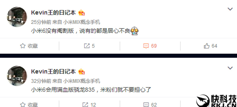 对此,@Kevin王的日记本表示,小米6会用满血版骁龙835,而且没有阉割版,“说有的都是居心不良”。