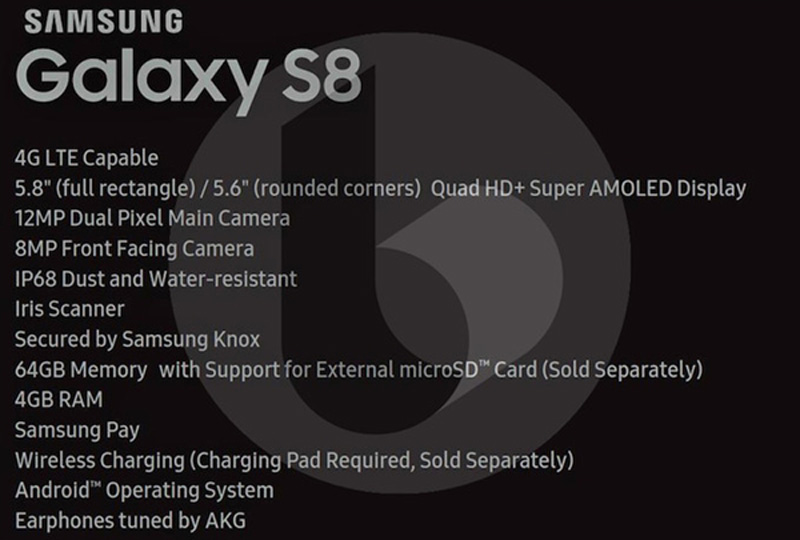 现在,爆料大神@evleaks送上了Galaxy S8的详细配置,其配备5.8英寸2K屏,行货版本的处理器为骁龙835,内置4GB RAM+64GB存储,依然是1200万像素摄像头(前置800万像素),具备IP68防护等级,提供虹膜识别功能。