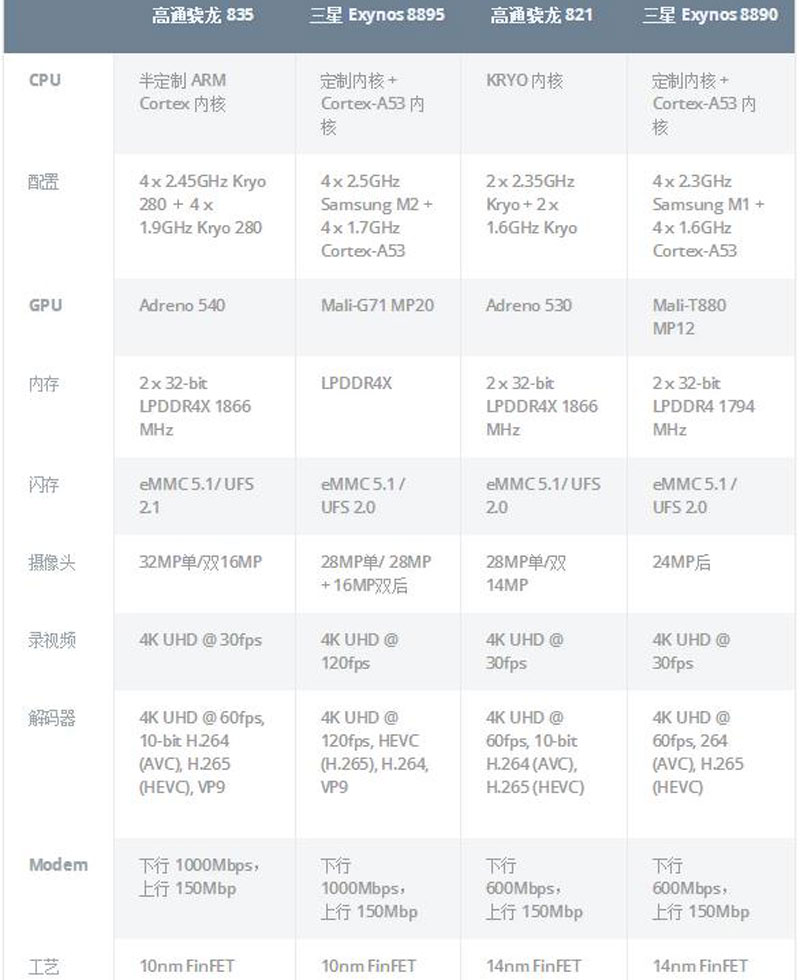 现在很多机友开始讨论,究竟是高通强还是三星厉害,考虑到目前还没有Snapdragon 835和Exynos 8895的成品设备,实际比拼肯定做不到。不过,我们可以从高通和三星官方公布的信息,来了解在性能和特色方面谁更占优势。下面先来看近两代高通和三星移动旗舰芯片的对比图: