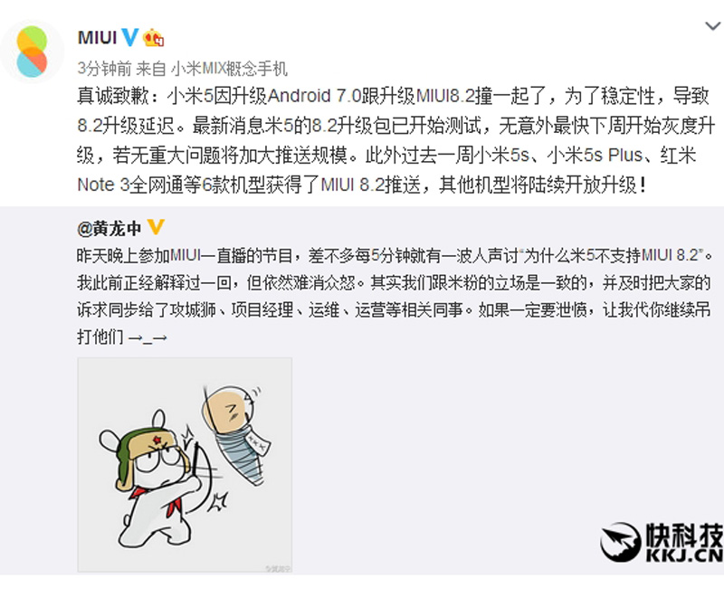 MIUI官微随后致歉,小米5确实是因升级安卓7.0和升级MIUI 8.2撞一起了,为了稳定性,导致MIUI 8.2升级延迟。